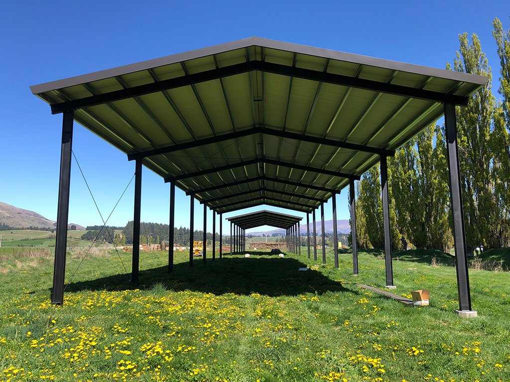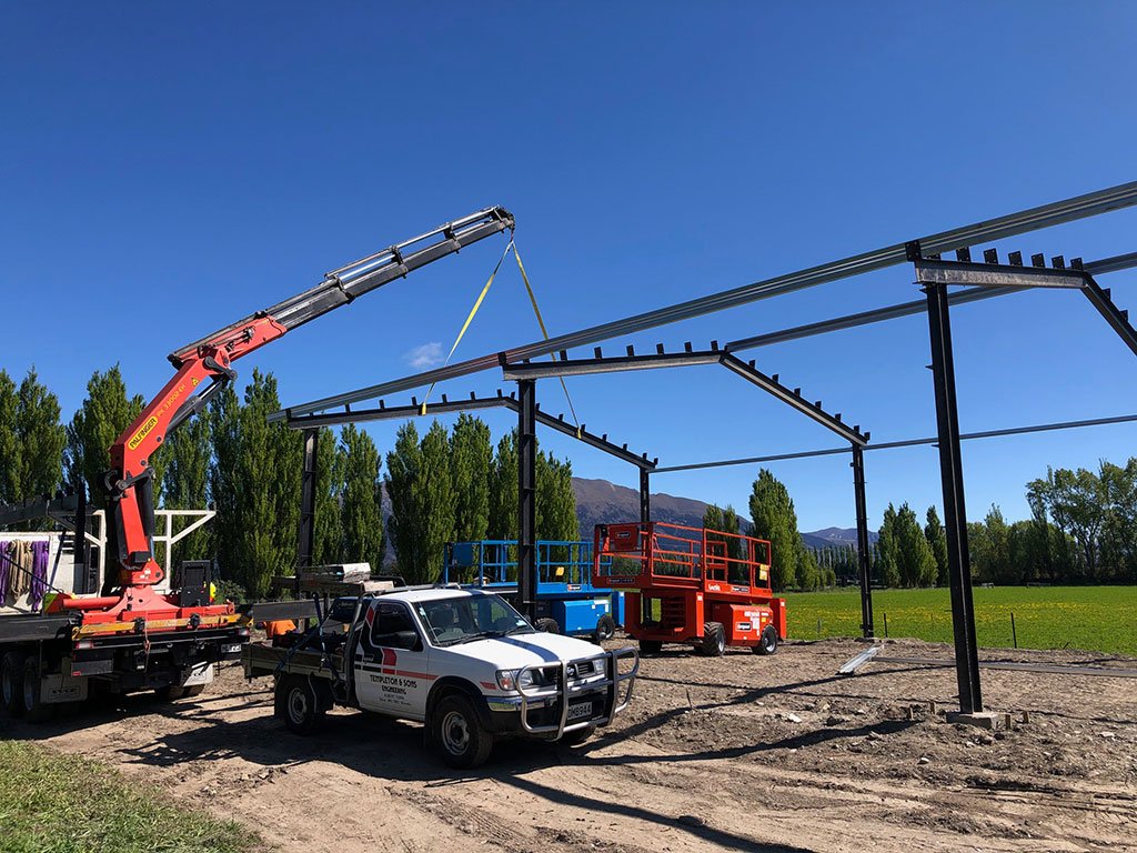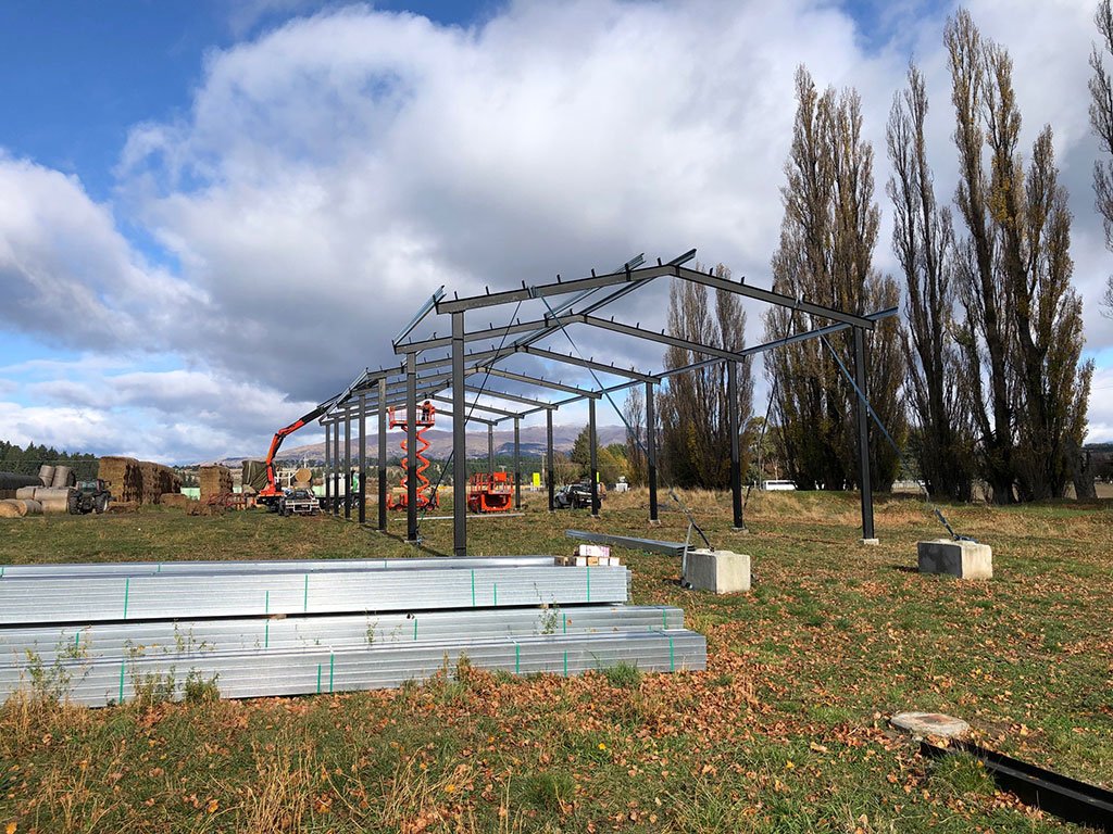 Tractor implement shed 250UB portals being lifted into place by Lakeland Contracting.