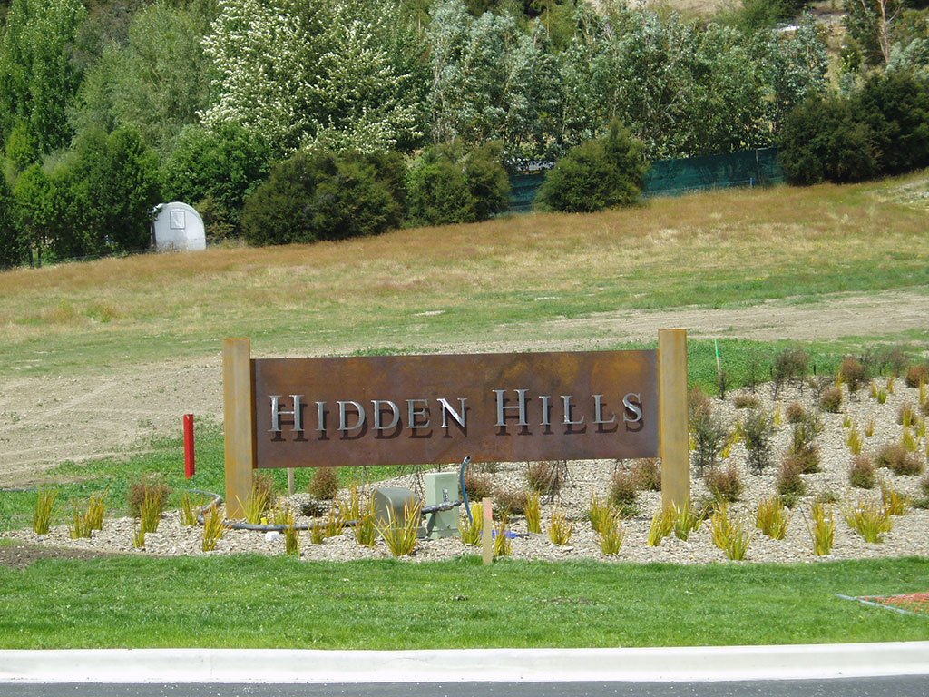 Hidden Hills sign, custom made, corten, stainless, Northlake Wanaka