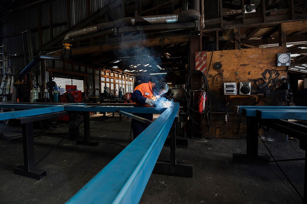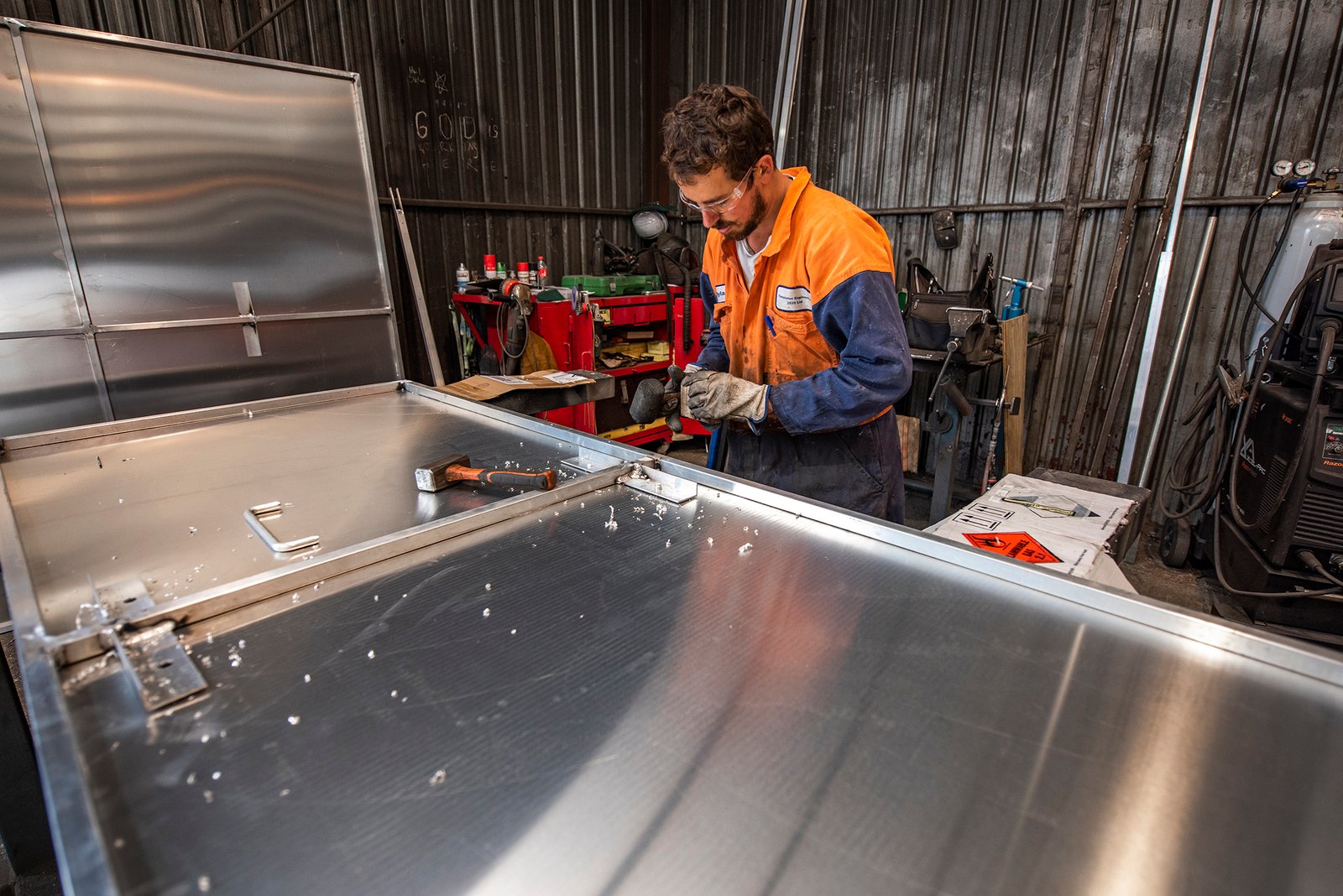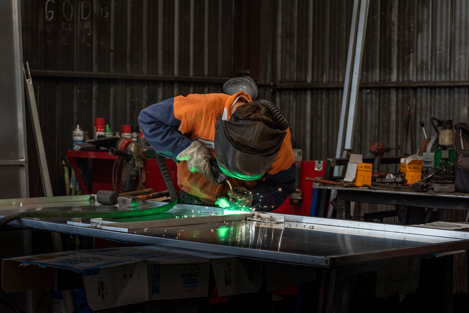 Structural fabrication, flux core welding, adflow helmet, pre primed RHS