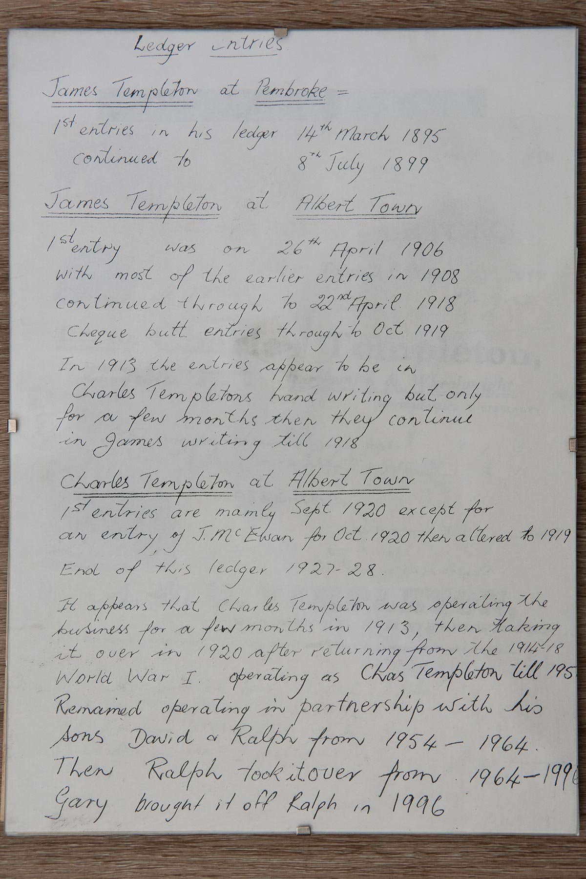 Charles (Chas) Templeton’s ledgers began in 1913, through to 1954 at which time his sons David and Ralph joined the business. Ralph then took over in 1964 and traded through until 1996 when his son Garry took over the business. In 2020 Garry introduced Mathew Read to the business as a director. Matt and his wife Sarah took over as company owners in 2021.